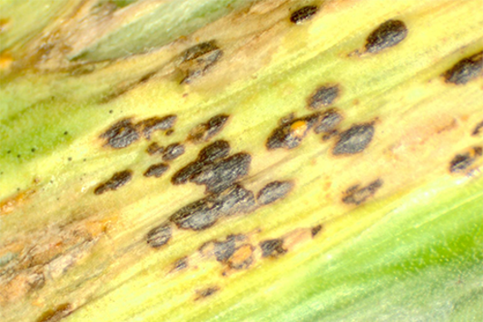 - Black or orange spores break out of the lesions as the infection develops.